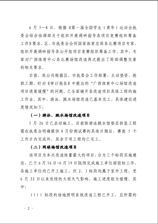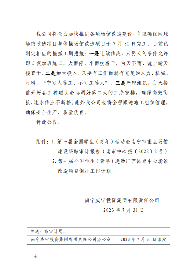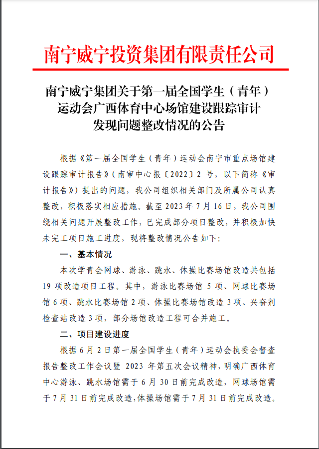 南宁威宁集团关于第一届全国学生(青年)运动会广西体育中心场馆建设跟踪审计发现问题整改情况的公告