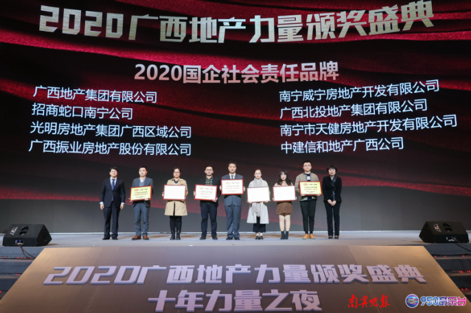 近日,威宁房地产公司在由南宁晚报和广西广播电视台FM950联合主办、南宁市房地产业协会协办的2020广西地产力量颁奖盛典上连获“2020国企社会责任品牌”、“2020广西地产匠心代表作(威宁青运村)”、“2020广西商业综合体美好城市服务标杆(威宁邻家广场)”等多个奖项,收获了满满的荣誉。